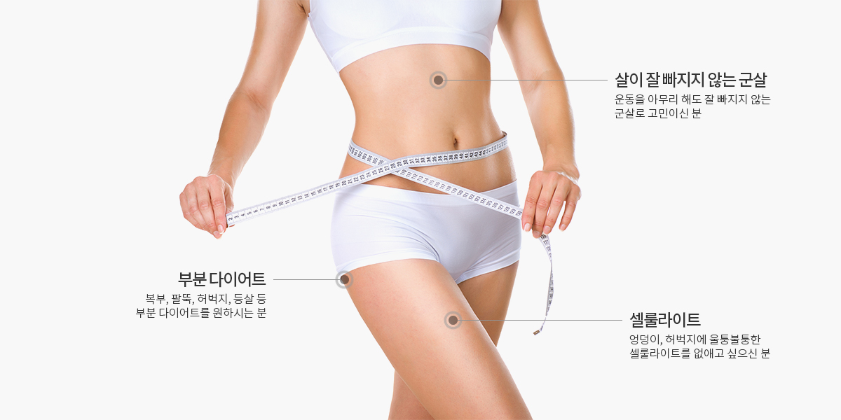 단순히 지방을 녹이거나 배출시키는 것은 누구나 할 수 있습니다. 하지만 단순한 체중 감량 만으로는 아름다운 신체 라인을 만들 수 없습니다. 체형까지 관리해야 제대로 된 비만 관리입니다.
